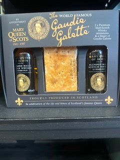 Gift pack containing 2 x 5cl bottles of blended malt Scotch Whisky, and a finger of Gaudie Galette, also known as Black Bun.